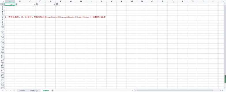 一、第一行先弄好年月日,分别用year(today())、month(today())、day(today())函数表达出来,如下图所示