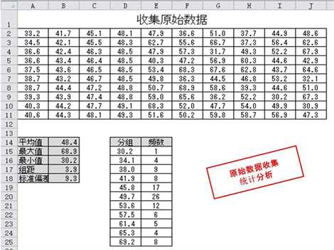 最佳答案直方图制作步骤:步骤1、收集100个测量数据,用函数在A14:B18单元格中计算以下统计数据平均值计算公式: “=AVERAGE($A$2:$J$11)”最大值计算公式: “=MAX($A$2:$J$11)”最小值计算公式: “=MIN($A$2:$J$11)”组距计算公式 : “=ROUNDUP(......
