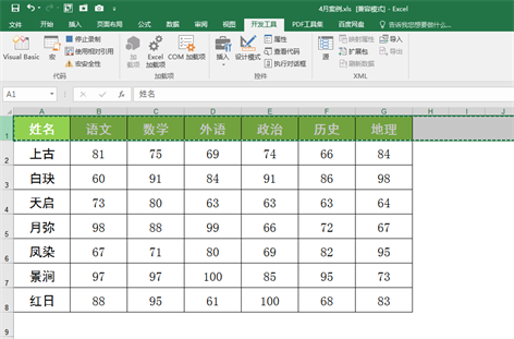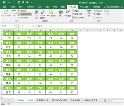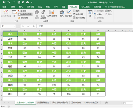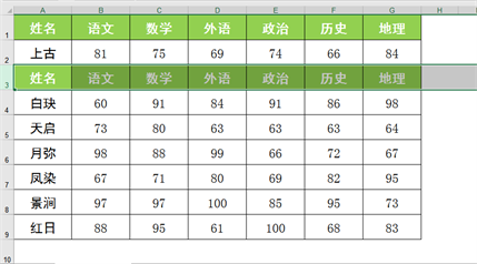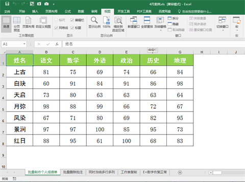 10 返回工作表,可见剩余5个人的成绩上方也批量添加好了科目名称。