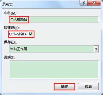 2 在打开的“录制宏”对话框中,我们可以修改默认的宏名以及快捷键,这里我们将“宏名”设为“个人成绩单”,快捷键设为“Ctrl+Shift+M”,单击“确定”按钮,就可以开始宏的录制了。