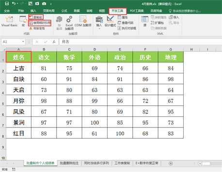 最佳答案应用案例在下面图1工作表中每个人的成绩上方都插入第一行中绿色底纹的科目名称,以便制作个人成绩单,参考效果见图2。图1图2操作步骤1 选中A1单元格,在“开发工具”选项卡先单击“使用相对引用”按钮,再单击“录制宏”。2 在打开的“录制宏”对话框中,我们可以修改默认的宏名以及快捷键,这里我们将“宏名”设......