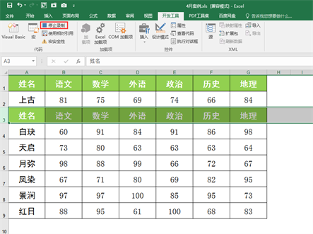 5 单击“开发工具”选项卡下的“停止录制”按钮,停止宏的录制。