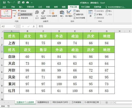 代码说明:代码中新增的内容“For i = 1 To 5”和“Next”代表将前面录制好的宏重复5次(因为还剩下5个人的成绩上方需要复制插入科目名称)。