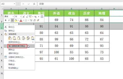 4 选中第3行,单击鼠标右键,在弹出的菜单中选择“插入复制的单元格”。