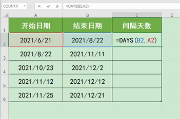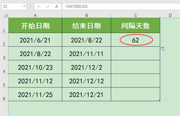 1 选中C2单元格,在英文状态下输入公式:=DAYS(B2,A2),回车确认公式,即可得到B2单元格与A2单元格中两个日期之间间隔的天数。