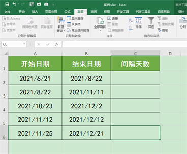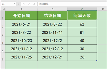 下面我们来看一下应用案例,下图工作表A列和B列中分别为开始日期和结束日期,接下来我们要将每行开始日期和结束日期之间的间隔天数返回在C列中。