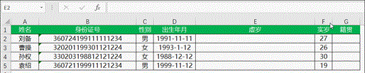 说明:DATEDIF(TEXT(MID(B2,7,8),"0-00-00"),TODAY(),"Y"),计算当前日期和出生日期的年差值,即实际岁数