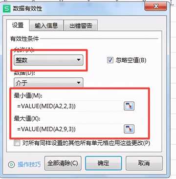 在此时的【数据有效性】界面,在允许条件中选择【整数】,数据选择【介于】,输入下图中公式即可。
