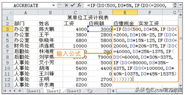 按照前面的分析,根据计税规则,定位E3单元格,在E3单元格中输入公式“=IF(D3<500,D3*5%,IF(D3<=2000,D3*10%-25,IF(D3<=5000,D3*15%-125,IF(D3<=20000,D3*20%-375,IF(D3<=40000,D3*25%-1375,IF(D3<=60000,D3*30%-3375,IF(D3<=80000,D3*35%-6375,IF(D3<=100000,D3*40%-10375,D3*45%-15375))))))))”,如下图所示。