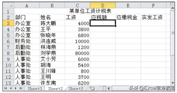 根据前面的分析,应税额只计工资大于1000元的部分,此处用一个IF函数。