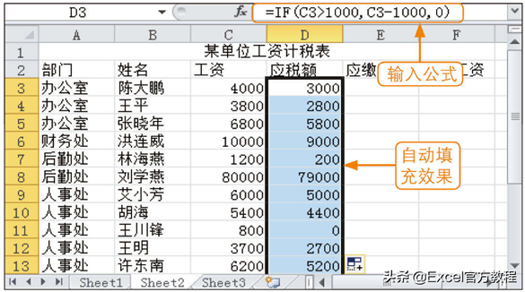 选择D3单元格,在编辑栏中输入公式“=IF(C3>1000,C3>1000,0)”,按【Enter】键计算结果,使用自动填充功能计算下面单元格的应税额,如下图所示。