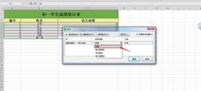 最佳答案1、找到电脑上的Excel表格,是一张学生成绩表格。 2、把需要排序的数据框住,点击顶端状态栏中的“数据”-“排序”,会出现如下图的页面。 3、在“主要关键字”中选择你想要排序的数据列。这里我们选择“语文成绩”,操作如下图。 4、在排序依据中选择“数值”选项......