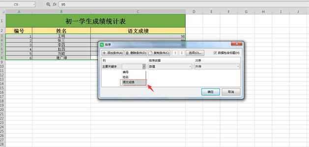 3、在“主要关键字”中选择你想要排序的数据列。这里我们选择“语文成绩”,操作如下图。