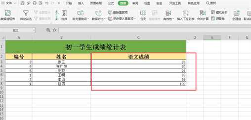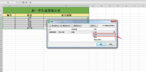 6、最后点击对话框中的确定按钮,即可完成对成绩的升序排列。如图所示: