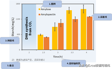 首先拆分一下图表的组成部分,里面主要有图例、误差线、刻度线、坐标轴标题、备注等五部分构成。