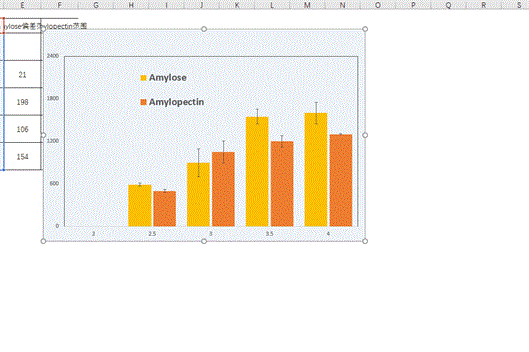 在右侧的“+”添加误差线,误差值需要添加正负偏差的误差值,这里采用是指定值,正负误差均是同一列的值。再设置橙色柱条的误差线。