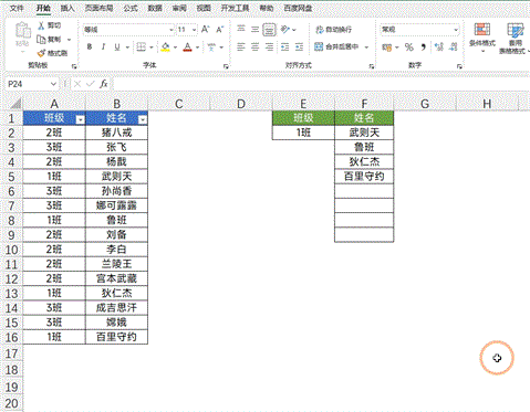如下图所示,我们想要找到1班对应的所有姓名,只需要将公式设置为 =FILTER(B2:B16,A2:A16=E2,”找不到结果”)
