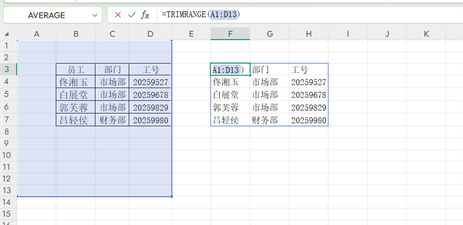 例如输入公式=TRIMRANGE(A1:D13),即便A1:D13这个范围里有很多空白单元格,函数返回的也只是真正有数据的区域。更贴心的是,之后如果在这个范围内新增或删除数据,结果会自动同步变化,不用再手动调整公式里的区域参数。