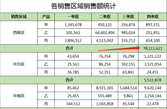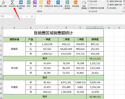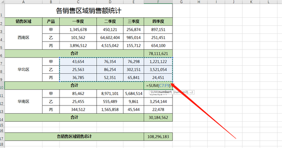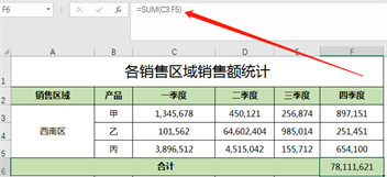 利用sum函数求一下西南区,四个季度的销售总额,如图求合计: