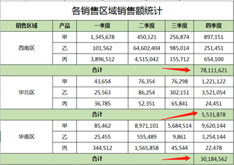 利用相同的方式把华北区、华南区四个季度销售额求出来。