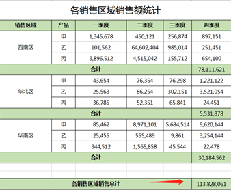 第二步利用各个区域四个季度的销售额汇总求公司一年的总体销售额