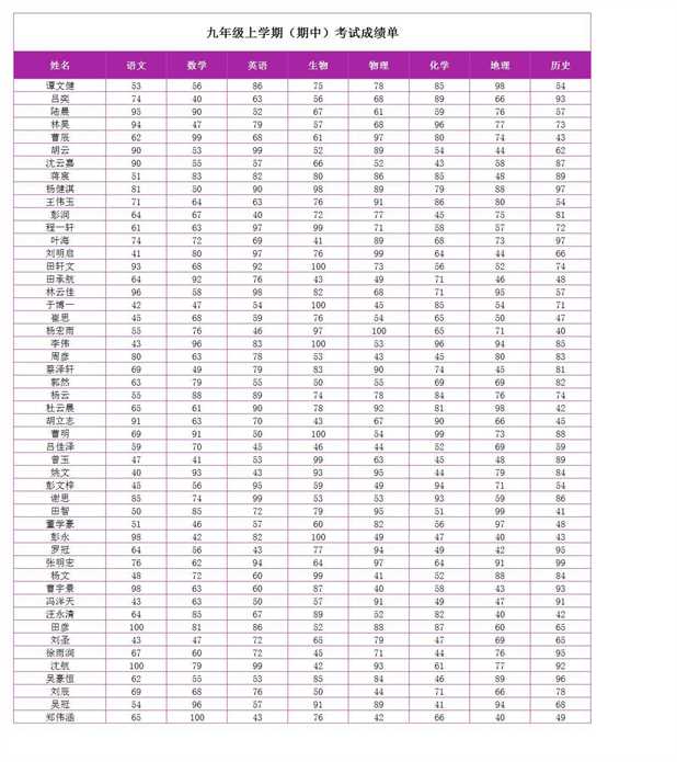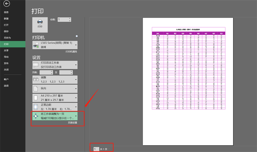 如下图所示,是一份班级同学的考试成绩单,现在需要将所有内容打印到一张A4纸内:
