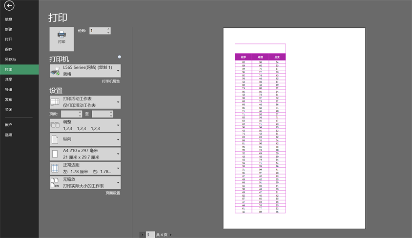 步骤1、打开班级同学的考试成绩单Excel表格,ctrl P打开打印界面,发现一份成绩单被分为了4页: