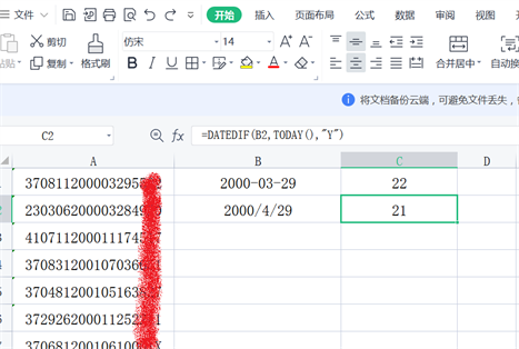 三、如果把某人的生日是2000-4-29,因为今天是2022年4月5日,还没到他的生日,因此他的年龄应该为21岁。如图所示。