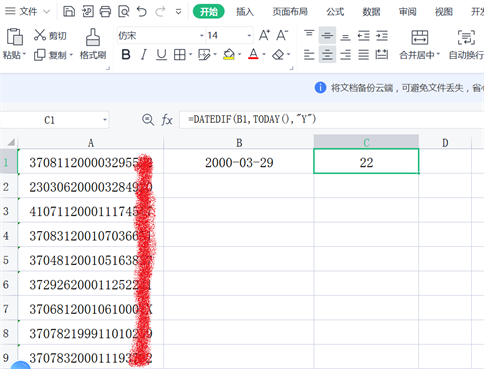 二、根据生日,利用公式=DATEDIF(B1,TODAY(),”Y”),计算当前年龄(精确到月),比如今天是2022年4月5日,下面这个例子中的年龄是22岁。如图所示。