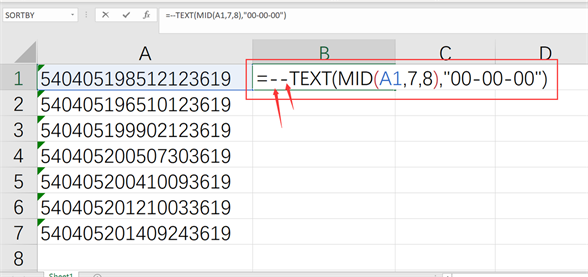 这个公式,主要是根据MID函数从A列身份证号码里的第7位开始,提取8个数字,再用TEXT函数将提取出来的数字转换成“00-00-00”格式,现在提取出来的带横杠的日期还是文本格式,无法转换成其他日期格式,前面添加两个“—”,将文本格式转换成日期格式。