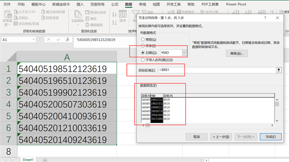 在第三步里,选中下方预览框里第一列和最后一列,勾选“不导入此列”,选中第二列,勾选“日期”,后面选择日期格式YMD或其他,点击目标区域,选择日期放置的单元格。