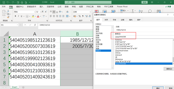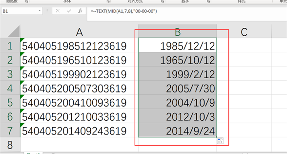 点击确定,A列身份证号码里的出生日期提取出来,选中B列的日期格式,可调整为其他日期格式。