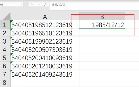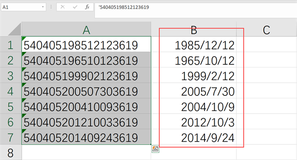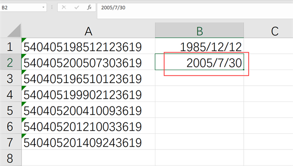 A列输入身份证号码,B列第一个单元格内手动输入第一个身份证号码里的出生日期(用斜杠日期格式),身份证号码里的出生日期就是从第7位开始,连续8个数字代表出生的年月日。
