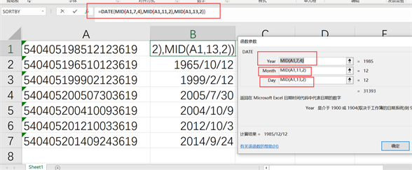 这里主要使用了DATE函数,后面三个参数,分别代表年月日,通过MID函数分别提取出身份证里对齐的数字。