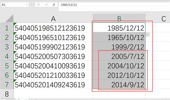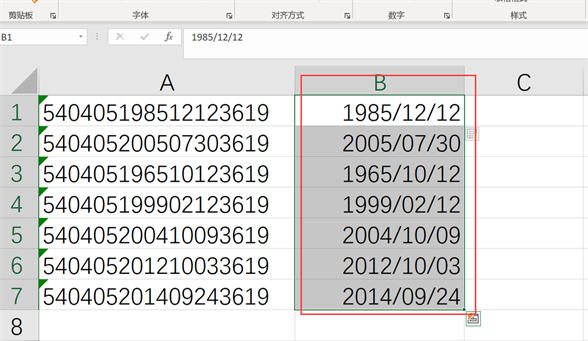 点击确定,B列设置好日期格式后,选中B列里添了日期的单元格和下方的空白单元格,按下CTRL E,批量提取出A列身份证号码里的日期,核对下,提取正确。