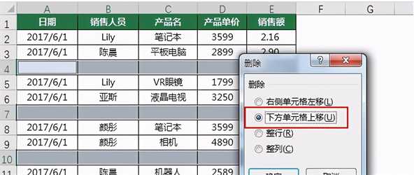 点击鼠标右键,在弹出菜单中选择“删除”菜单,删除所有空行,弹出【删除】选项窗口。在此窗口框中,选中[movelowercellup]选项,然后单击确定删除所有空行。