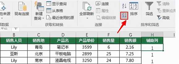 将鼠标定位在辅助列中,点击“排序和筛选”中的“降序”按钮,将数据表按降序排序。