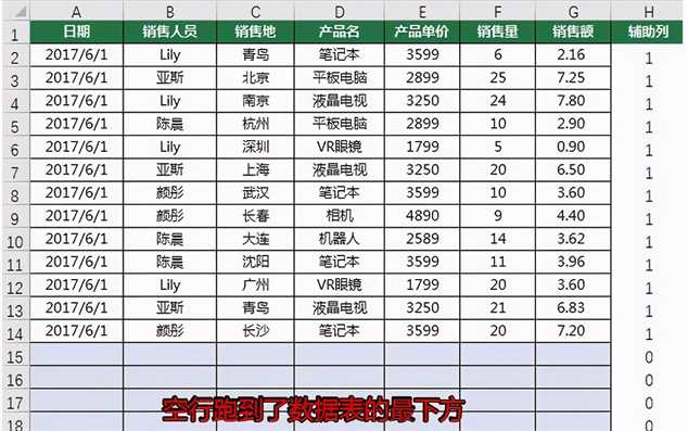 排序后,值为0的列在值为1的列之后,即空行排在值的列之后,这样数据表中就没有空行了,相当于删除了空行,如图所示。
