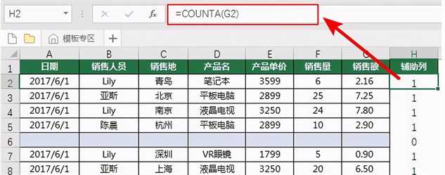 1、在数据表的末尾创建一个辅助列,在辅助列中写入公式:=counta(G2),然后复制并填充公式。