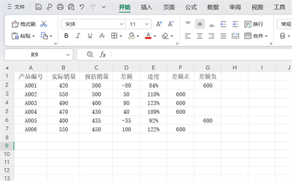 1.整理好制作图表所需的数据源,A-E列是基础数据源。其中D列的“差额”,需通过“实际值-预算值”的计算公式得出;“进度”则需用“实际值÷预算值”的公式计算获取。
