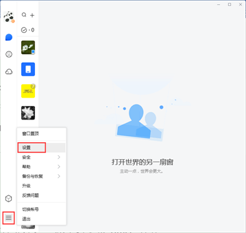 1.登陆qq软件,在打开的面板左下角点击三条横线的按钮,在弹出的菜单中选择“设置”选项。