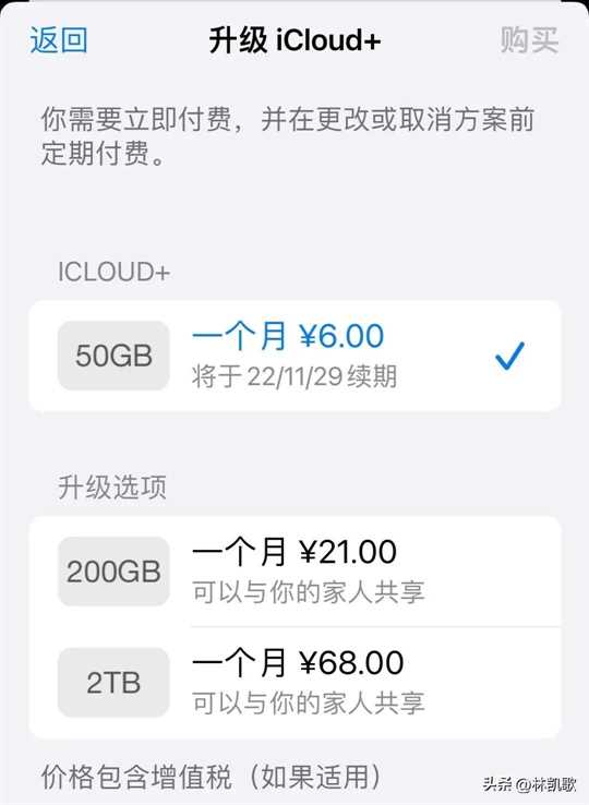 iCloud的免费容量是5GB,升级50GB、200GB和2TB的费用分别是6元、21元和68元每月(没办法买了6元50GB的套餐)。