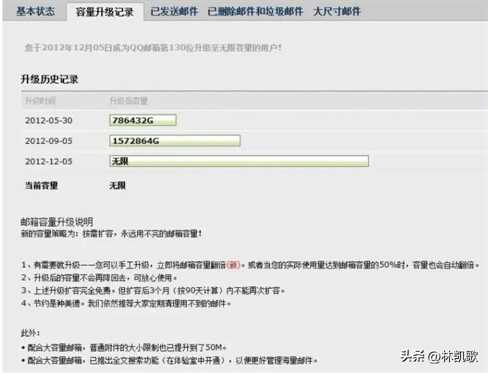 据称早些时候,QQ邮箱有免费扩容的福利。用户注册邮箱后可以每3个月到邮箱里手动扩展一次,每一次都是翻倍升级。而当你的邮箱容量用到50%以上,系统也会自动给你翻倍扩容,从而实现某种程度上的“无限容量”。