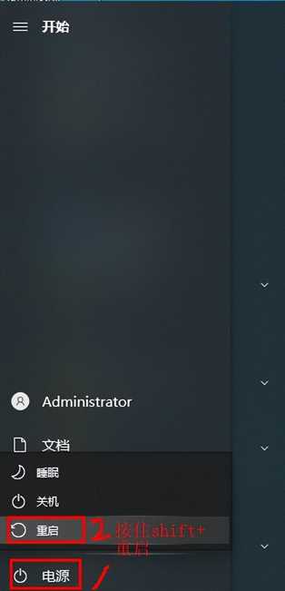 右键开始按钮,选中“命令提示符(管理员)”,输入 shutdown /r /o回车