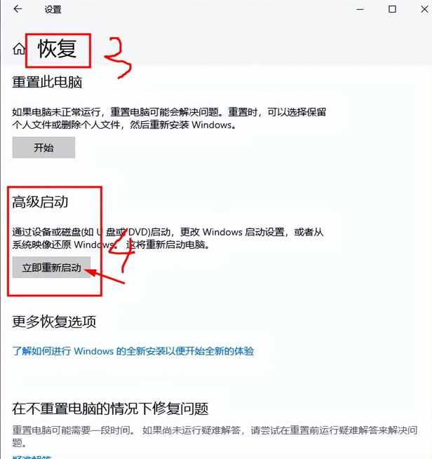 开始→电源按钮,按住Shift同时点击“重启”,然后Win10会自动进入高级启动菜单,再点击疑难解答→高级选项→启动设置→重启