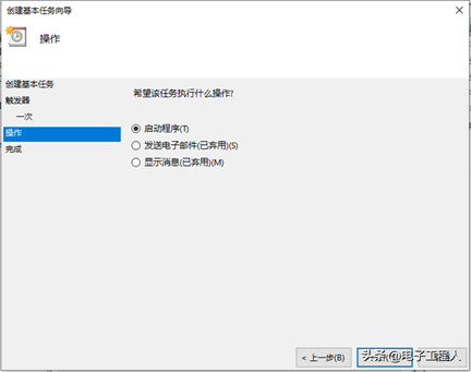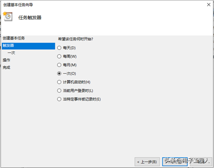4、希望任务何时开始:及关机设置的频率。如果只是使用一次,点选“一次”,然后点击“下一步”即可。这里我们选择“一次”。
