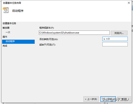 7、进入“启动程序”项,如果系统在C盘,那么在“程序或脚本”框内输入“C:Windowssystem32shutdown.exe”,如何系统安装在别的盘,修改下盘符即可,然后在“参数”处填入“-s -t 0”(即立即关机),然后点击“下一步”。