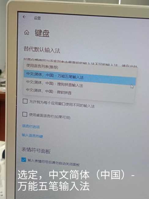6.选定,中文简体,(中国)-万能五笔输入法,松开鼠标左键。