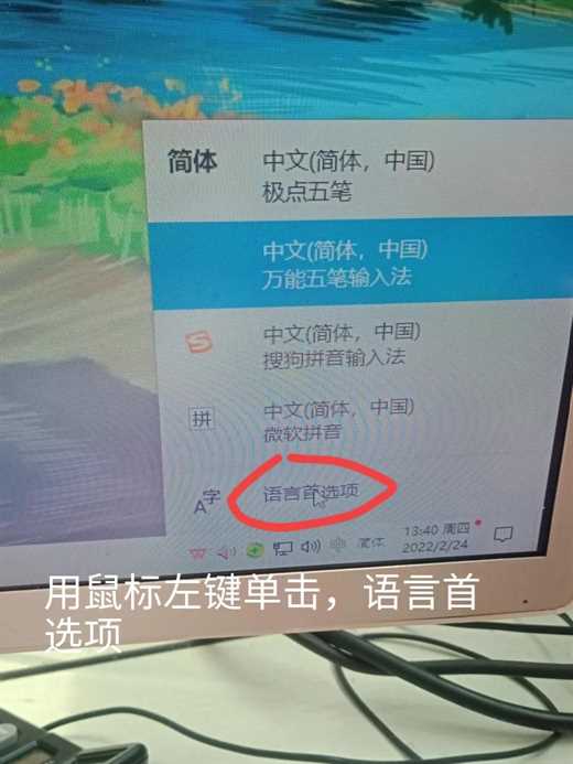 最佳答案 2.用鼠标左键点击一下,语言首选项2.用鼠标左键单击一下,语言首选项3.用鼠标左键点击一下,语言。3.用鼠标左键单击,语言4.用鼠标左键点击一下,键盘。4.用鼠标左键单击,键盘。5.用鼠标左键,点击一下,输入法框右边的小三角。5.用鼠标左键,单击输入法框右边的小三角。6.选定,中文简体,......
