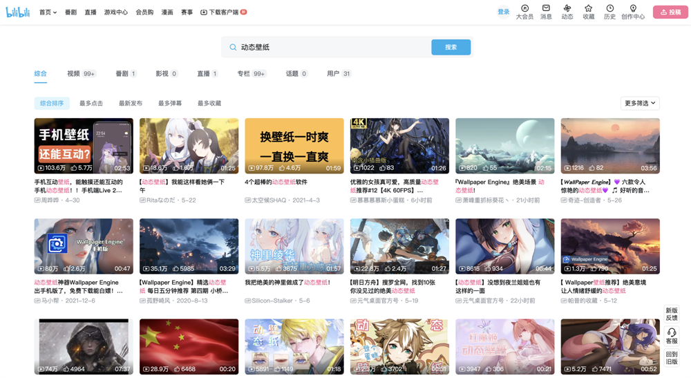 B站里就有很多由up主制作和收集的动态壁纸,质量非常高,各种类型都有,直接搜索就可以找到!如果你发现有好看的短视频,也可以直接下载下来,设置为壁纸动态桌面。